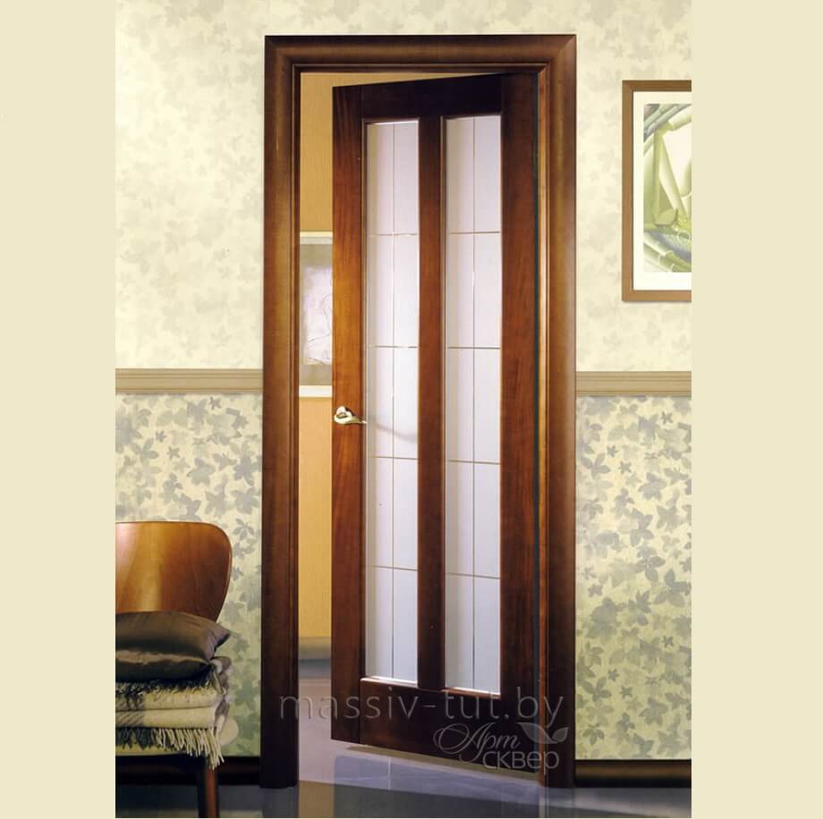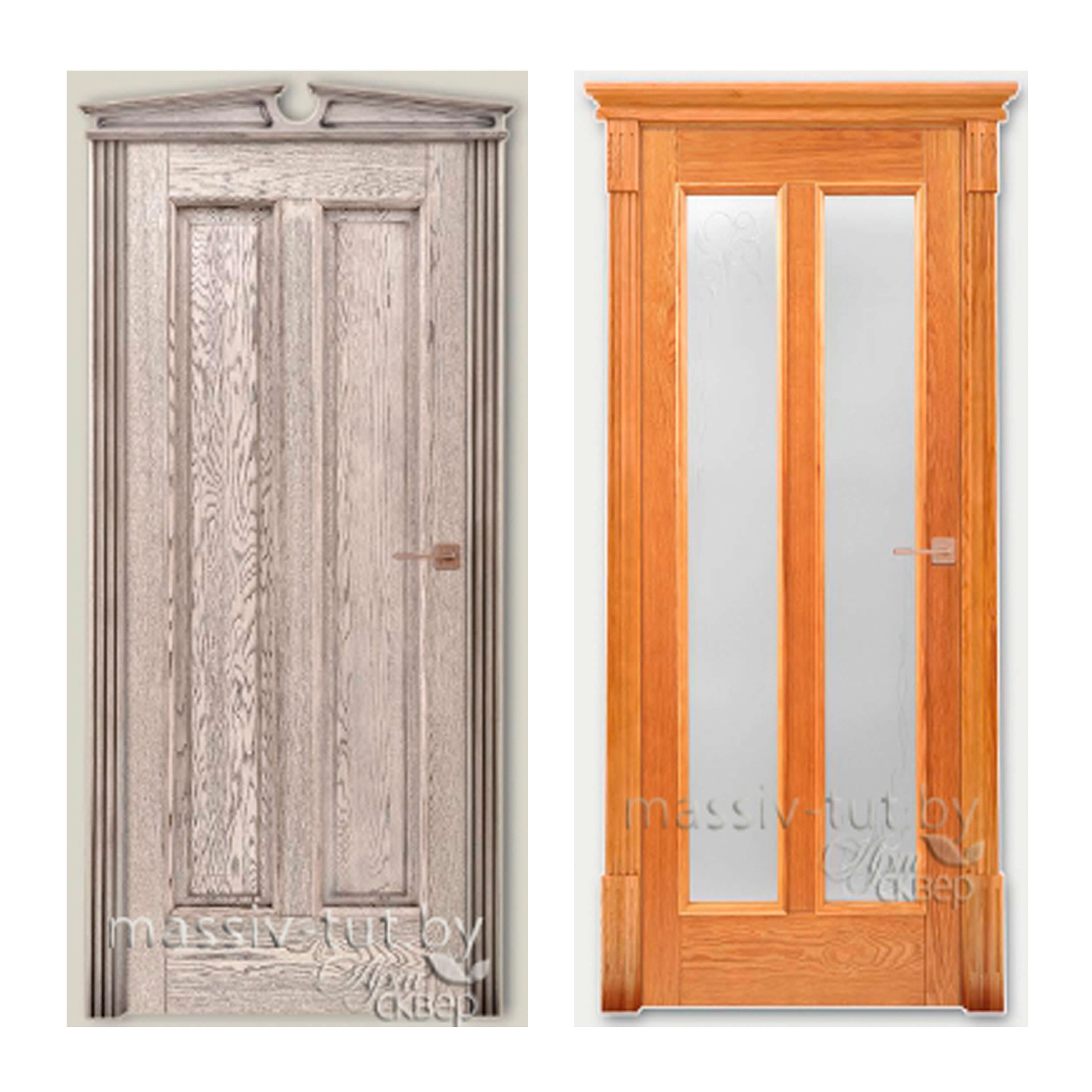 Каждая модель может быть изготовлена в разных вариантах отделки. Конструкция двери филенчатая. Каркас, все детали двери и комплектующих выполнены из 100% массива дуба. На поверхности дверного полотна отсутствуют сучки и различные дефектные места. Рисунок деталей оптимально подобран. Все детали конструкции склеены двухкомпонентным карбамидным клеем шведской фирмы CASCO Products. Все детали сверху покрываются трехслойным лаковым покрытием. Коробка прямоугольная с уплотнителем. Наличники: плоские, фрезерованные и колонны.