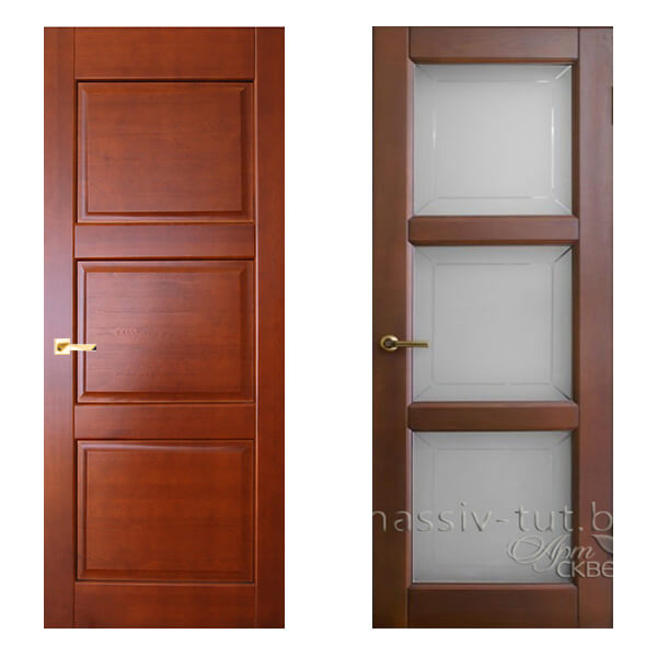 Каждая модель может быть изготовлена в разных вариантах отделки. Конструкция двери филенчатая. Каркас, все детали двери и комплектующих выполнены из 100% массива дуба. На поверхности дверного полотна отсутствуют сучки и различные дефектные места. Рисунок деталей оптимально подобран. Все детали конструкции склеены двухкомпонентным карбамидным клеем шведской фирмы CASCO Products. Все детали сверху покрываются трехслойным лаковым покрытием. Коробка прямоугольная с уплотнителем. Наличники: плоские, фрезерованные и колонны.