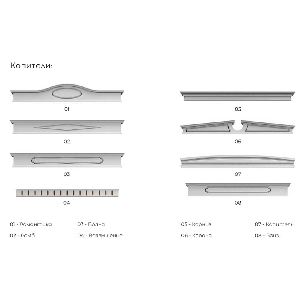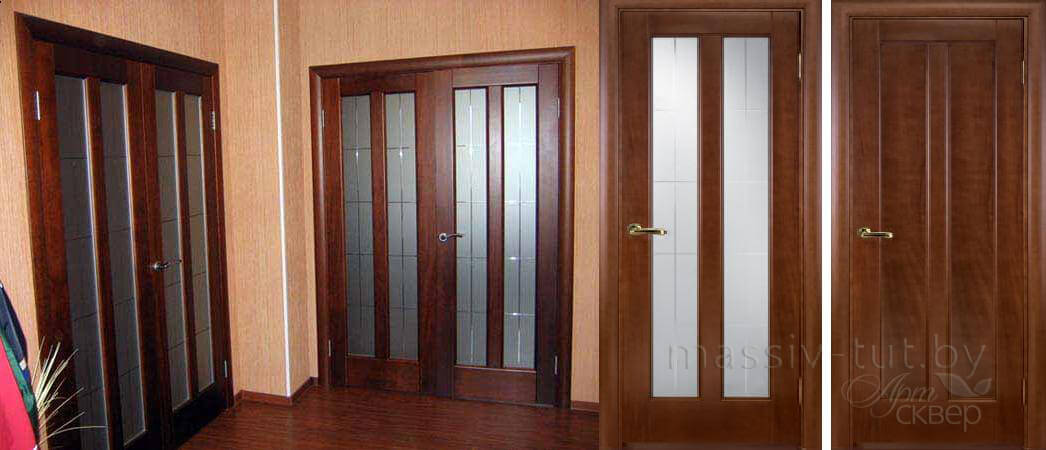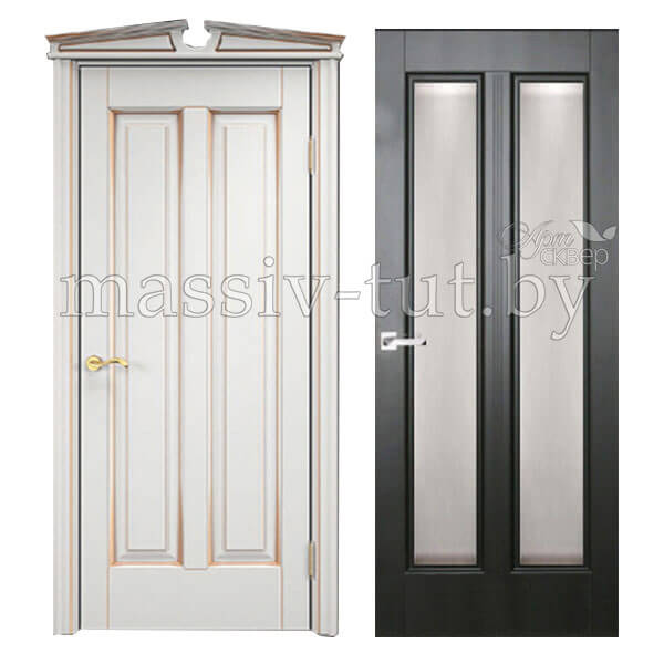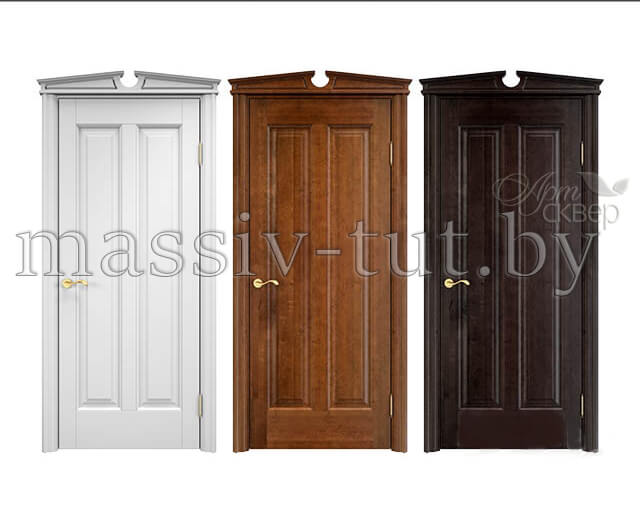 Каждая модель двери может быть изготовлена в разных вариантах отделки. Конструкция двери филенчатая. Каркас, все детали двери и комплектующие выполнены из 100% массива ольхи. На поверхности дверного полотна отсутствуют сучки и различные дефектные места. Рисунок деталей оптимально подобран. Все детали конструкции двери склеены двухкомпонентным карбамидным клеем шведской фирмы CASCO Products. Все детали сверху покрываются трехслойным лаковым покрытием. Коробка прямоугольная с уплотнителем. Наличники (плоские, фрезерованные и колонны).