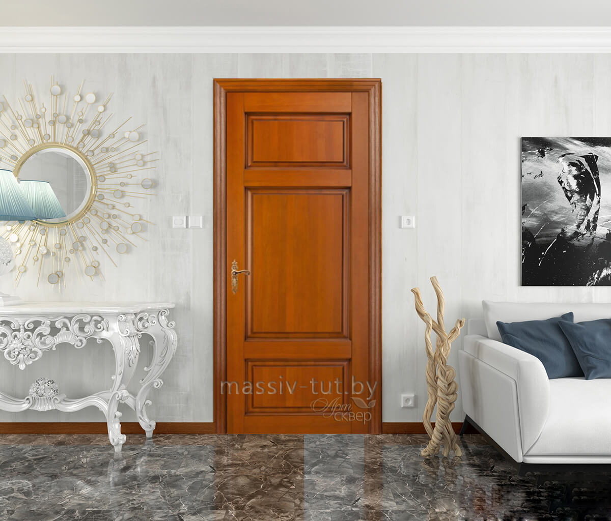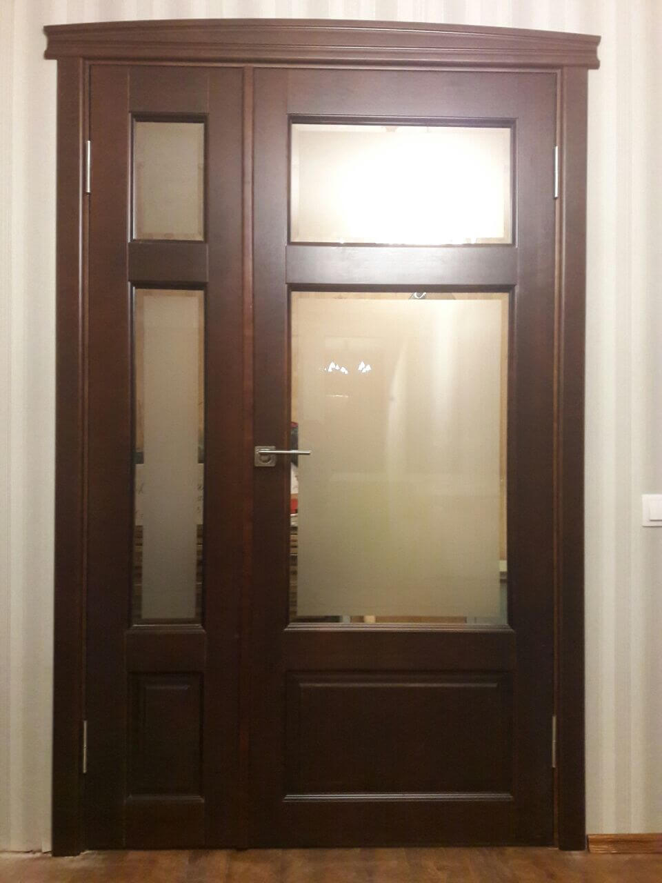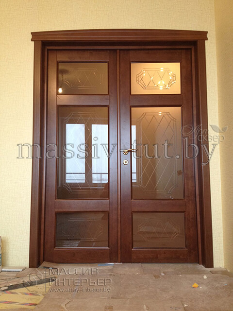 Каждая модель двери может быть изготовлена в разных вариантах отделки. Конструкция двери филенчатая. Каркас, все детали двери и комплектующие выполнены из 100% массива ольхи. На поверхности дверного полотна отсутствуют сучки и различные дефектные места. Рисунок деталей оптимально подобран. Все детали конструкции двери склеены двухкомпонентным карбамидным клеем шведской фирмы CASCO Products. Все детали сверху покрываются трехслойным лаковым покрытием. Коробка прямоугольная с уплотнителем. 15 вариантов наличников.