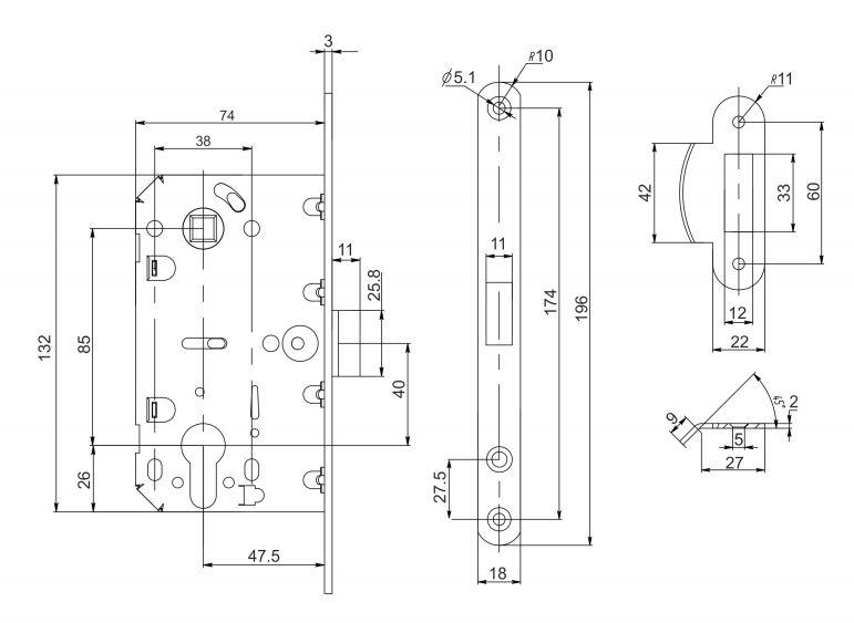 Замок-защелка с засовом врезная под цилиндр