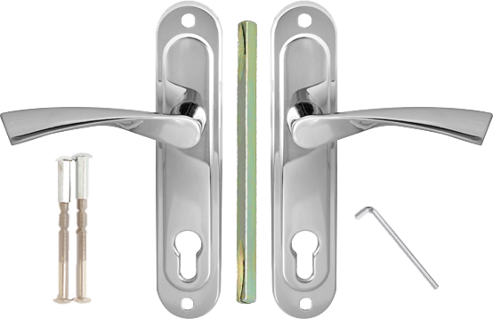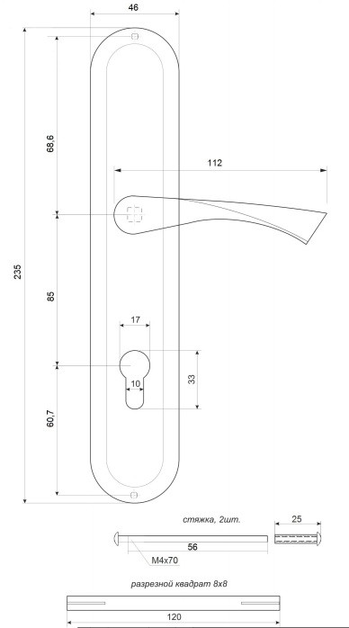 Замок врезной + ручка на планке + цилиндровый механизм с ключами (ключ-ключ (0823/60-NI) или ключ-вертушка (0823/60-C-NI))