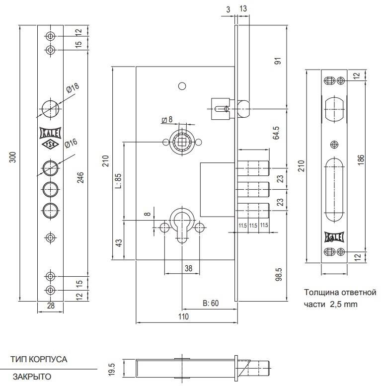 Замок врезной Модель: Kale Kilit 252R Производитель Kale Kilit Тип упаковки Пакет Назначение Общее Рекомендован для установки в входные двери Да Рекомендован для установки в межкомнатные двери Нет Тип крепления Лицевая планка Тип ригелей Цилиндрические Диаметр ригеля 16 мм Вылет ригелей 34.5 мм Количество ригелей 3 Удаление ключевого отверстия (Backset) 60 мм Тип механизма секретности Цилиндровый Тип цилиндрового механизма Евроцилиндр Цвет лицевой планки Хром Защелка Классическая Межосевое расстояние 85 мм Левый/правый/универсальный Универсальный Класс безопасности 4 (высший) Размер сечения квадрата ручки 8 мм Автоматическое запирание Не автоматическое Тип защелки Универсальная Вид замка Врезной Наличие ответной планки в комплекте Нет Защита от отмычек Нет Защита от высверливания Нет Защита от сворачивания Нет