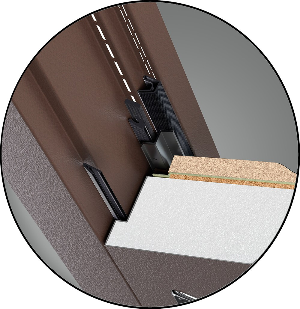Четыре контура уплотнителей, три из которых лепестковые, гарантируют герметичное примыкание двери к коробу. При этом два контура уплотнителей стыкуются друг с другом.