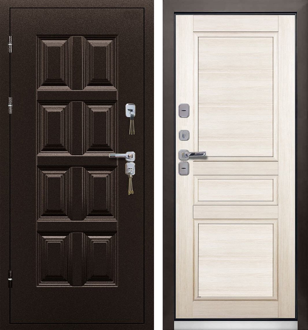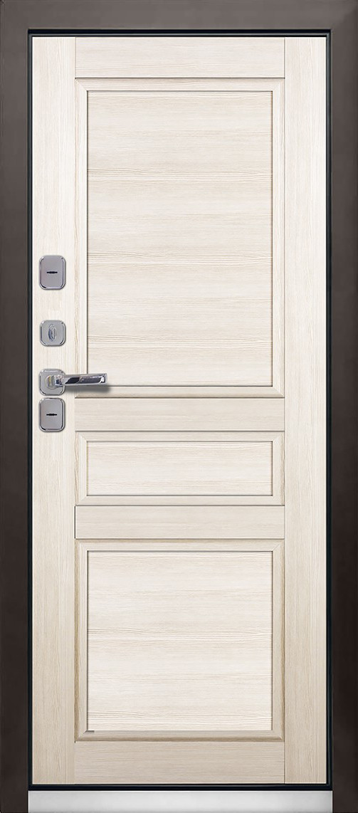 Дверь «ВИНТЕР» это оптимальное решение для уличной двери в коттедж. Она принадлежит к классу дверей «термо», имеющих повышенные характеристики по теплоизоляции и устойчивости к атмосферным явлениям. Усиленное цельногнутое полотно толщиной 100 мм с тепло изолирующим контуром из ПВХ пластика, двойной терморазрыв в коробе по технологии «лабиринт», 3 контура уплотнения, 2 надежных сувальдных замка высшего класса секретности, атмосферостойкое покрытие с цинковым грунтом, накладка на порог из нержавеющий стали и внутренняя 16 мм царговая панель в классическом дизайне обеспечат тепло и уют в вашем доме.