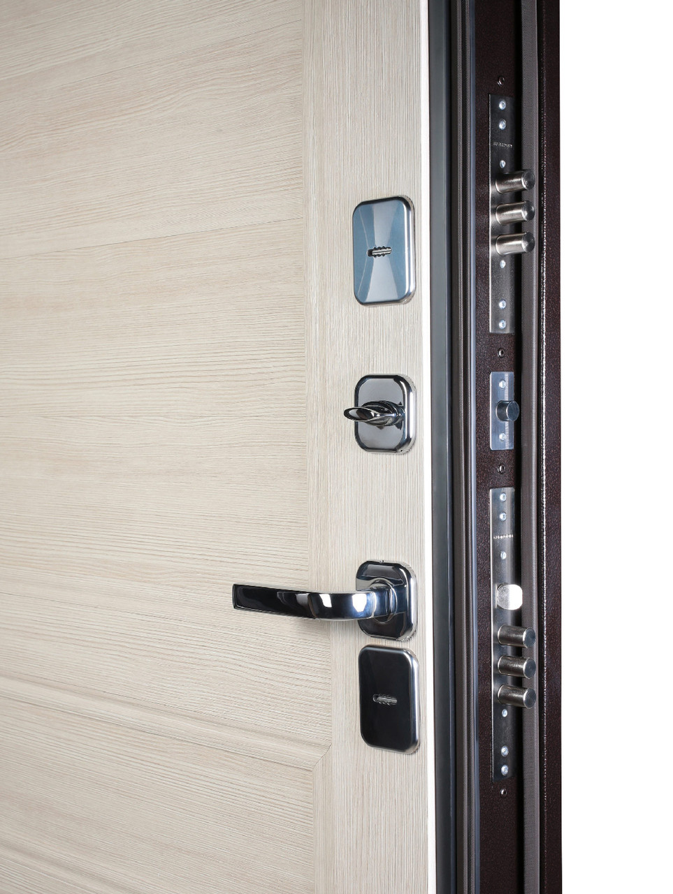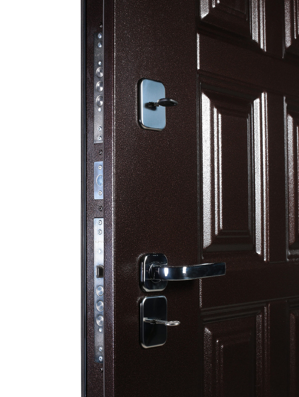 На двери «Винтер» установлены 2 надежных сувальдных замка лучшего российского производителя ГАРДИАН (гарантия 7 лет). Ключевые накладки оборудованы подпружиненными шторками, которые отсекают поток холодного воздуха. Для удобства пользования ключи от верхнего и нижнего замков имеют разную длину.